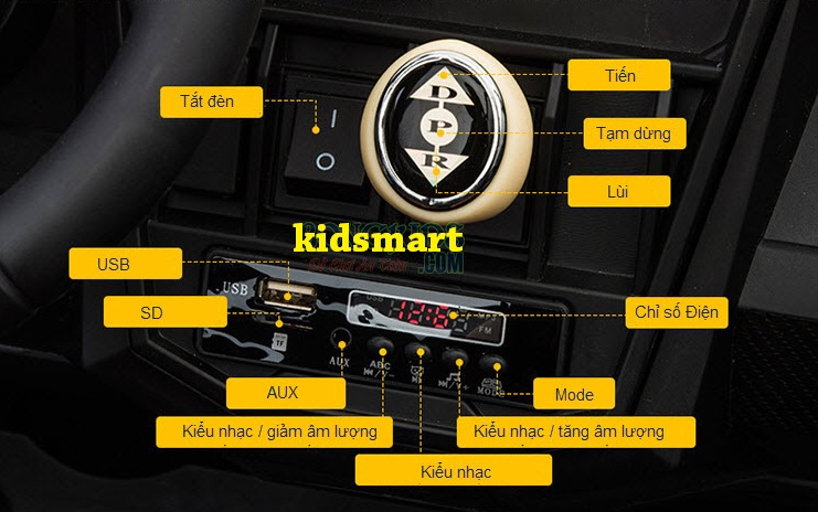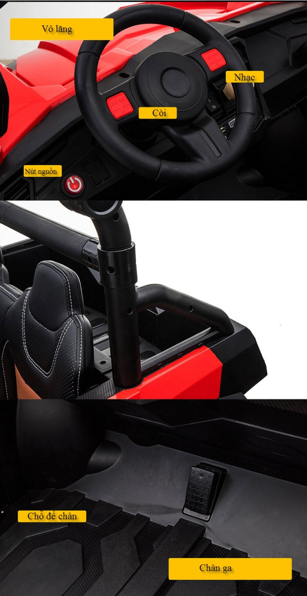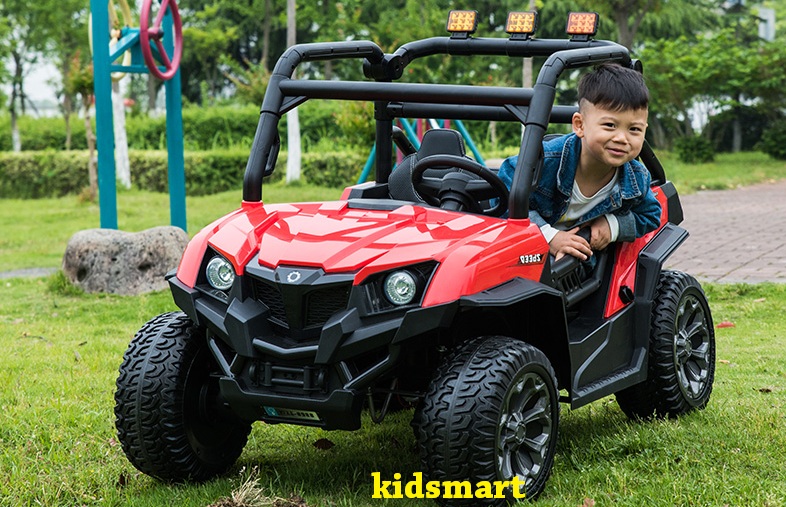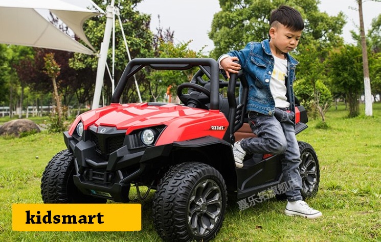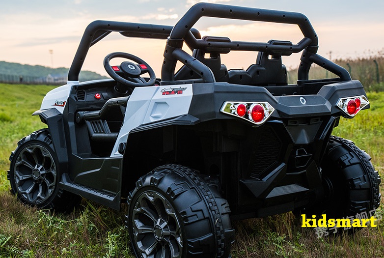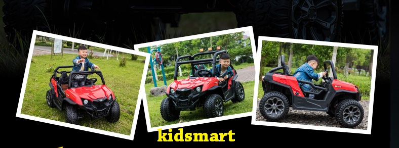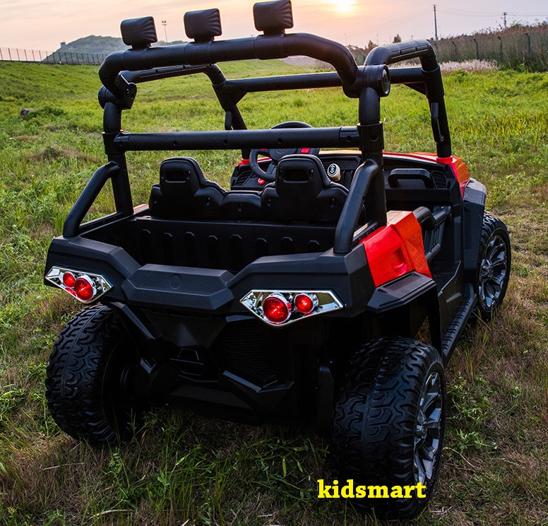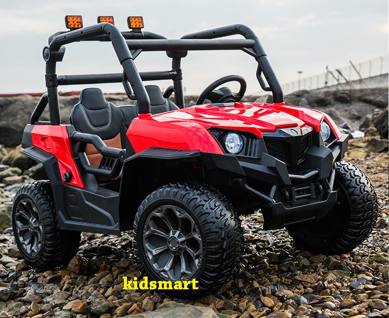 - Dáng địa hình khoẻ với gầm cao, bánh to, thiết kế góc cạnh. Tải trọng 90kg, ghế da, bánh cao su, thành cửa cao. 4 động cơ khủng. Xe có đầy đủ chức năng MP3, USB, thẻ nhớ, đèn, còi...